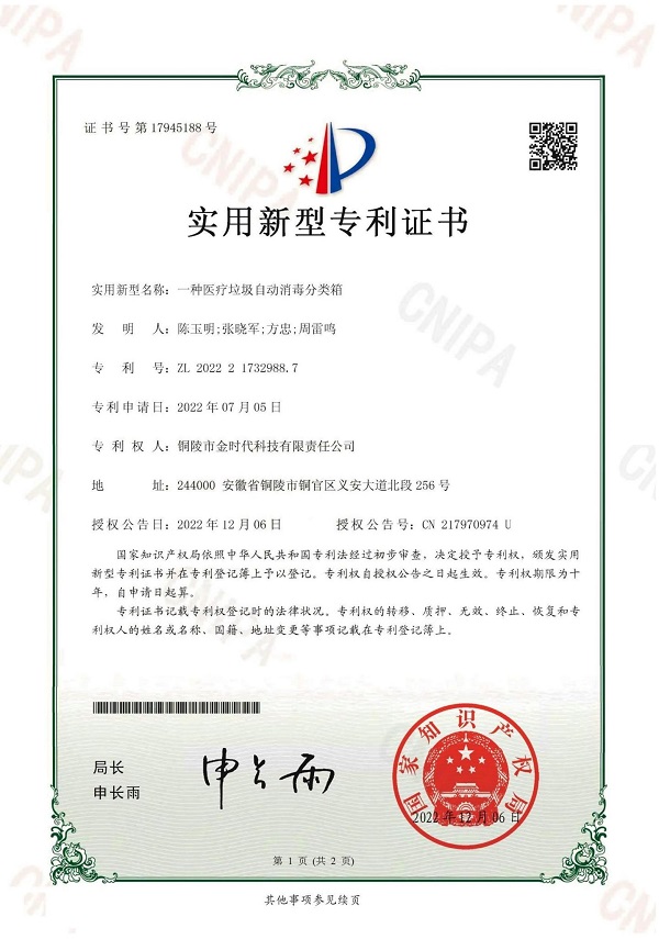 實用新型專利:一種醫(yī)療垃圾自動消毒分類箱